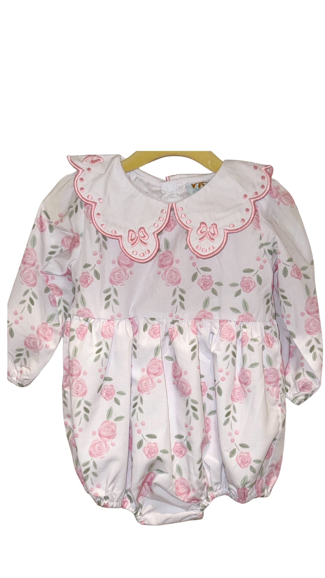 Sweet, soft, and simply precious — our Riley's Roses Bubble is the picture of timeless southern charm. Featuring a delicate pink rose print and the most darling scalloped collar with embroidered bows, this heirloom-inspired piece is perfect for every dainty little darling.